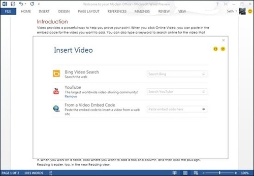新版Word中支持在內部程序直接搜索主流視頻網站內容,包括通過Bing搜索和Youtube上輸入關鍵詞進行搜索,當然你也可以直接復制視頻的嵌入式代碼到Word里面。