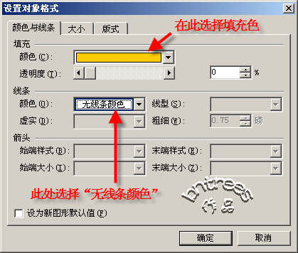 首先,用繪圖工具畫一個與頁面一樣大的矩形框,覆蓋住整個頁面。然后在此矩形框上點擊鼠標右鍵,在右鍵菜單中選擇“設置對象格式”,將對話框中的“填充顏色”設置成你喜歡的顏色(如金黃色),將“線條顏色”設置為“無線條顏色”(圖3),點“確定”退出。