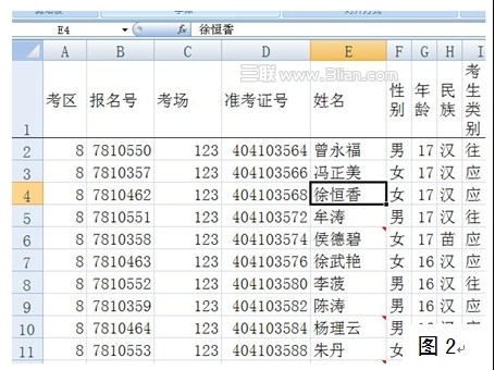 在excel或金山電子表格中建立一個工作表,輸入每個學生的準考證號、姓名、考場號,或者直接調用縣招生辦下發的考生信息電子表格,將文件命名保存。(如圖2)