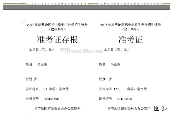 在WPS文字2007中,點擊“工具”菜單,選擇“郵件合并工具欄”,工具欄中顯示“郵件合并”工具。單擊“郵件合并”工具欄的第一個圖標“打開數據源”,將彈出“選擇數據源”對話框,根據剛才保存的數據文件的目標路徑,找到數據源并雙擊打開,會彈出對話框“選擇表格”,如果你的數據是在工作表“sheet1”,就選擇“sheet1$” 后按“確定”。接下來,在準考證存根“姓名”后插入光標,用鼠標單擊“郵件合并”工具欄第三個圖標“插入合并域”,彈出“插入域”對話框,選擇“姓名”后點“插入”,依此類推,在“性別”、“準考證號”后面以及“考場”前面分別插入相應域,并將存根上的域復制后粘貼到準考證相應的位置。為了實現套打的效果,我們還需將插入域以外的文字選擇,在“字體”設置中將其顏色設置為“白色”。最后,單擊“郵件合并”工具欄圖標“合并到新文檔”,出現“合并到新文檔”對話框,選擇“全部”,稍等片刻,系統會自動打開一個已經處理完畢的新文檔(如圖3),所有考生的準考證全部自動編排完畢,把空白準考證放入打印機,點出“打印”按鈕,余下來所有的工作就交給打印機了。