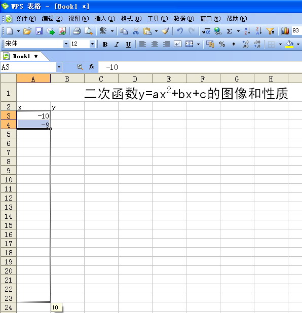 3、分別在A3、A4單元格內輸入“-10”、“-9”,拖動鼠標選中這兩個單元格后,將鼠標移動到單元格右下角的填充柄(就是那個黑色的小方塊)上,當鼠標指針變成黑色十字形時,按住鼠標左鍵向下拖動(如圖2)到A23單元格,這樣我們就利用WPS表格中的快速輸入法完成了自變量x值的輸入。