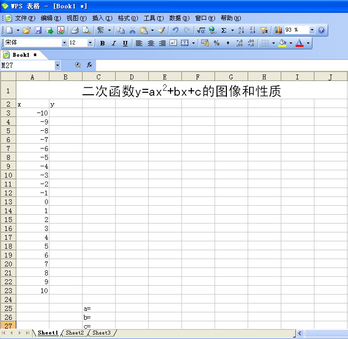 1、運行WPS表格,系統會自動建立一個空白工作薄,在A1單元格內輸入標題:二次函數y=ax2+bx+c的圖像和性質(標題文字中包含上標,在WPS表格中難以實現,可以先運行WPS文字,完成標題的輸入工作后,然后再將其復制到WPS表格中),標題文字較長,無法完全顯示,我們可以拖動鼠標左鍵選中A1~J1這10個單元格,再依次單擊格式工具欄里的“合并單元格”按鈕和“居中”按鈕,合并單元格并使文字居中顯示。