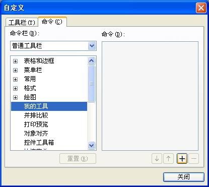 3、拖動對話框左側(cè)的滾動條,在“命令欄”下方的列表框中找到并單擊“我的工具”,再單擊對話框右下方的“+”按鈕(如圖4),彈出“添加”對話框。
