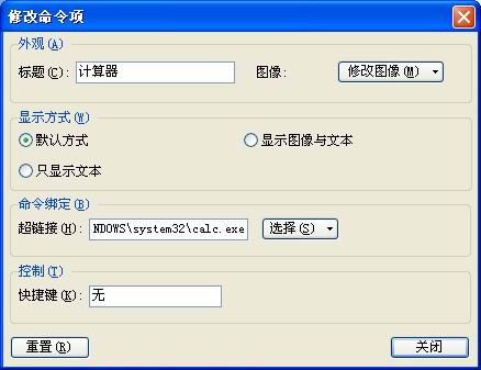 、用鼠標雙擊“自定義”對話框右側(cè)的“新按鈕”選項,彈出“修改命令項”對話框,將新按鈕的標題設置為“計算器”,在“超鏈接”選項右側(cè)的文本框內(nèi)輸入Windows系統(tǒng)自帶計算器的路徑“C:/WINDOWS/system32/calc.exe”,保持其他設置不變(如圖5),單擊右下方的“關(guān)閉”按鈕返回“自定義”對話框,此時您會發(fā)現(xiàn)“自定義”對話框右側(cè)的“新按鈕”選項已經(jīng)變成了“計算器”。
