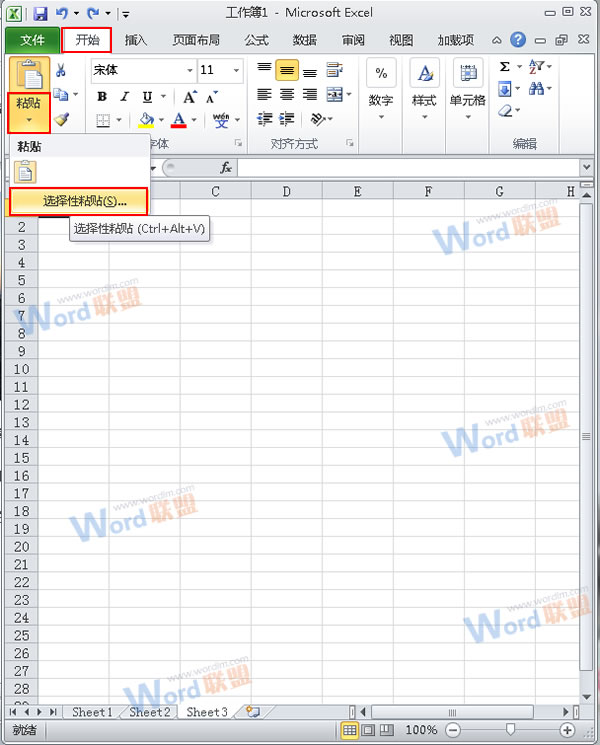 2、接下來啟動(dòng)Excel軟件,單擊“打開”選項(xiàng)卡,在“剪貼板”區(qū)域單擊“粘貼”選項(xiàng)組的下拉按鈕,在彈出的下拉菜單中選擇“選擇性粘貼”命令;