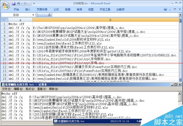 打開一個臨時工作表,首先,在A1單元格中輸入批處理命令的開啟符號@echo off,在A2單元格中輸入強制刪除命令del /f /s /q,并復制到A列的其他單元格中,其中/f參數表示強制刪除只讀文件;/s參數表示從所有子文件夾中刪除指定文件;/q參數表示安靜模式,即刪除時不需要進行確認操作。接下來,將需要刪除的文件路徑信息復制粘貼到B2單元格開始的B列單元格中。最后,復制該工作表中的所有內容,并將其粘貼到一個記事本文檔中,執行“文件→另存為”命令,將文本內容轉存為擴展名為bat的Windows批處理文件(圖6)。雙擊該文件,就可以飛快地批量刪除所有的無用文件。如果想將分布于不同文件夾中的重要文檔復制到同一個文件夾中進行備份,只需要將刪除命令del修改為復制命令copy,參數調整為/y,在C列中設置備份文件夾,參照上述批處理文件的生成方法,同樣可以實現文檔的快速批量備份操作。