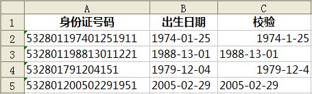 在圖1中,我們發現,由于輸入錯誤,導致提取出的出生日期中出現了“1988-13-1”(B3)和“2005-02-29”(B5)這樣在實際中不可能出現的日期。那么,我們如何把它們快速查找出來呢?