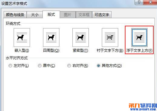 5.右擊文字,從右鍵菜單中選擇設(shè)置藝術(shù)字格式,彈出對(duì)話框,選擇浮于文字上方。