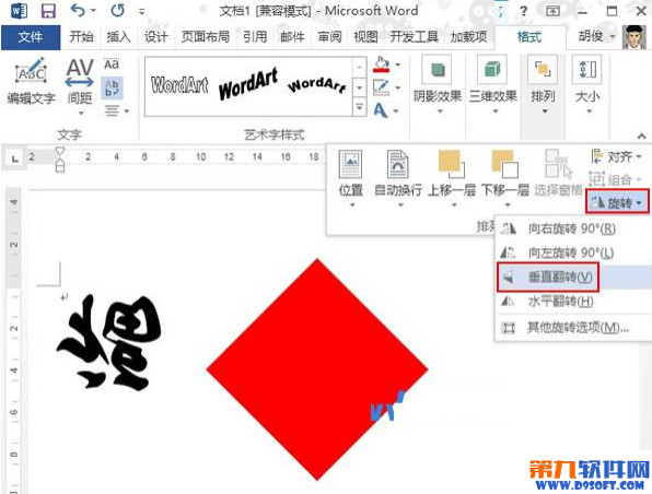 6.在格式--排列--旋轉(zhuǎn)選項(xiàng)中,將文字垂直翻轉(zhuǎn),形成倒立的樣子。