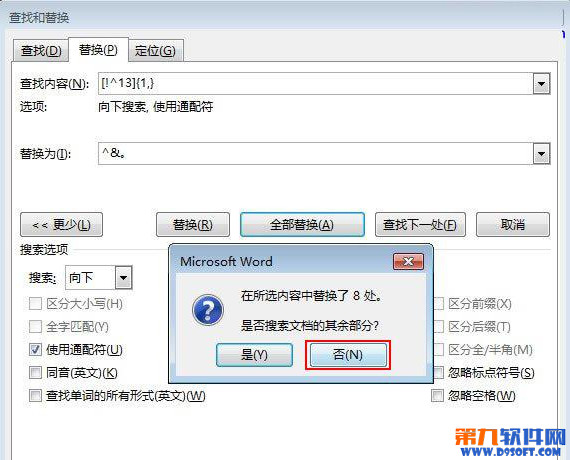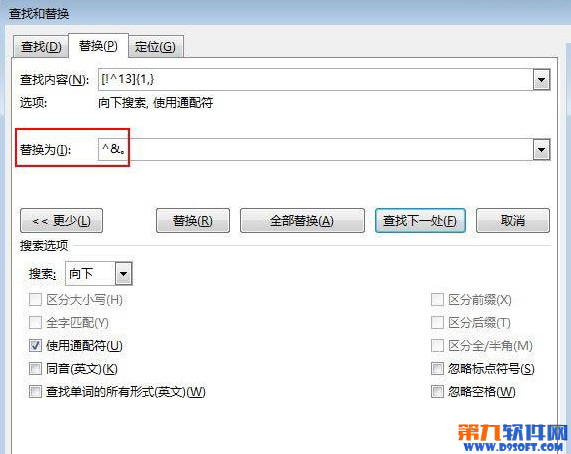 ①我們啟動Word2013,打開文檔,發(fā)現(xiàn)末尾處都沒有句號。按下鍵盤上的Ctrl+H,打開替換對話框。 ②單擊更多按鈕之后,勾選使用通配符。在查找內容中輸入: [!^13]{1,} ③在替換為里面輸入: ^&。 ④單擊全部替換按...