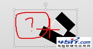 (一)將1號2號重疊放置(選中兩者,利用對齊中的“上下居中”和“左右居中”),3號的曲邊恰好遮住文字(矩形有一定傾角),如下圖(為方便觀看,將黑色設(shè)置了透明度)