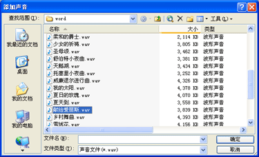 2)在“添加聲音”對話框上,選中需嵌入的聲音文件(如圖2所示,“獻給愛麗斯.wav”,3839KB),然后單擊“確定”。