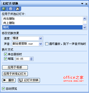 3)在任務窗格的“幻燈片切換”選項卡,“聲音”下拉式列表框中,就出現“獻給愛麗斯.wav”。聲音文件獻給愛麗斯.wav即嵌入該幻燈片中。