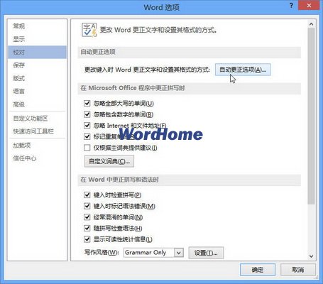 第2步,在打開的“Word選項”對話框中切換到“校對”選項卡,在“自動更正選項”區域單擊“自動更正選項”按鈕,如圖2所示。