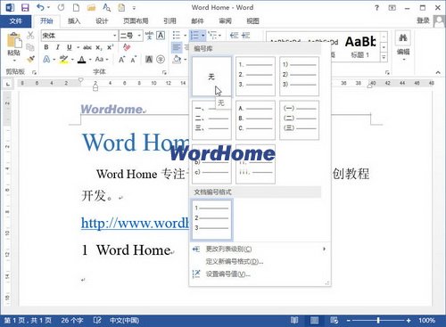 第4步,返回Word2013文檔窗口,在文檔中輸入任意數字(例如輸入阿拉伯數字1),然后按下Tab鍵。接著輸入具體的文本內容,按下回車鍵自動生成編號。連續按下兩次回車鍵將取消編號狀態,或者在“開始”功能區的“段落”分組中單擊“編號”下拉三角按鈕,在打開的編號列表中選擇“無”選項取消自動編號狀態,如圖4所示。