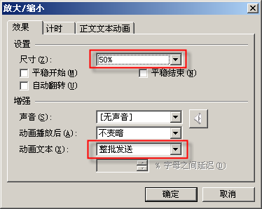 然后再次點擊“添加效果→強調→放大/縮小”,完成后雙擊動畫列表中的“放大/縮小”項,在設置面板中注意將“尺寸”由默認的“150%”改為“50%”或其它合適的比例,將“動畫文本”項由默認的“按字母”改為“整批發送”(圖2)。