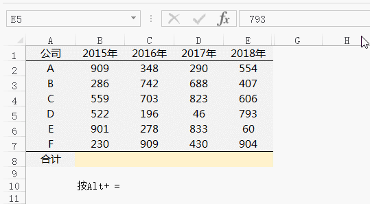 選取表格下面設置求和公式的空行,按Alt + = 即可一鍵求和。