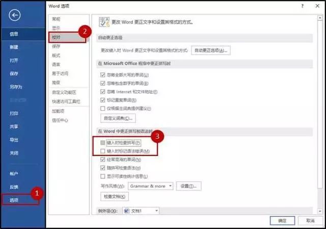 【文件】-【選項】-【校對】,取消勾選“鍵入時檢查拼寫”和“鍵入時標記語法錯誤”。