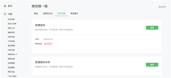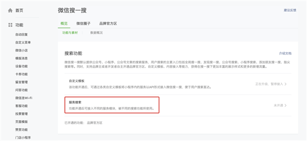 商家登錄微信公眾平臺,在“微信搜一搜”-“搜索功能”中點擊“服務搜索”,進入服務搜索頁。