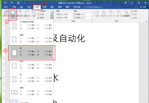 2、依次點擊【布局】選項卡>>【頁邊距】,在彈出的選項中點擊【窄】。