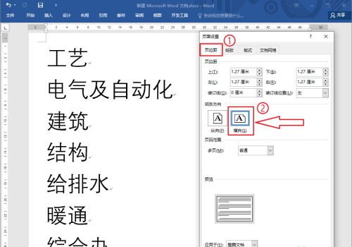 4、點擊【頁邊距】,紙張方向選擇“橫向”。
