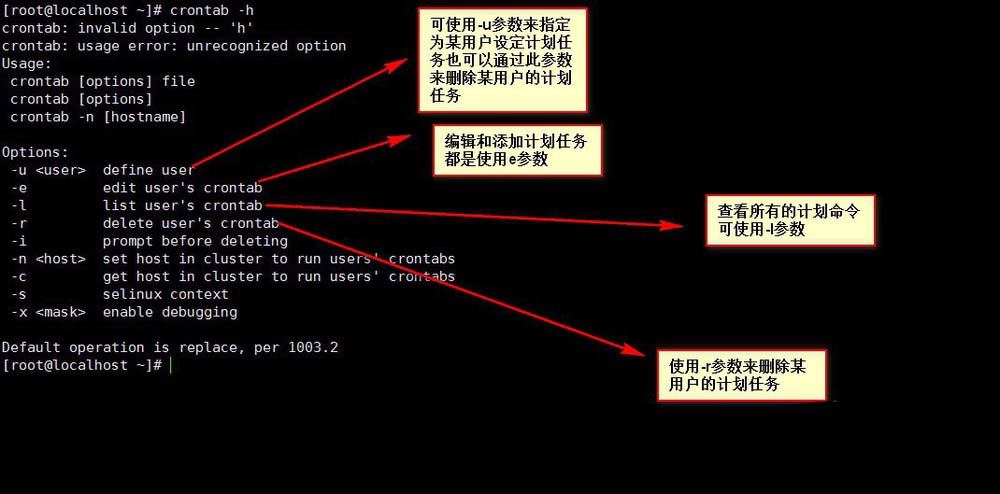 4、crond服務(wù)提供crontab命令設(shè)置計劃任務(wù),crontab命令可通過-h命令來查看一些參數(shù)信息