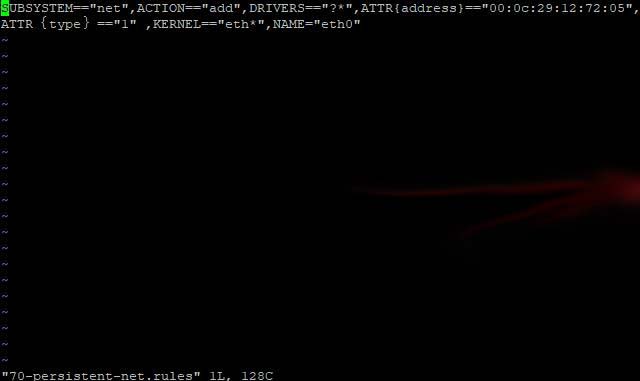 SUBSYSTEM=="net",ACTION=="add",DRIVERS=="?*",ATTR{address}=="00:0c:29:12:72:05",ATTR{type}=="1" ,KERNEL=="eth*",NAME="eth0"