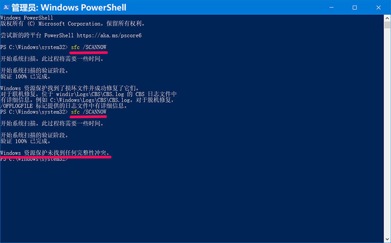 在Windows PowerShell(管理員)窗口中輸入 sfc /SCANNOW 命令,按下鍵盤上的回車鍵,待其運行完成,顯示 資源保護未找到任何完整性沖突 即可。