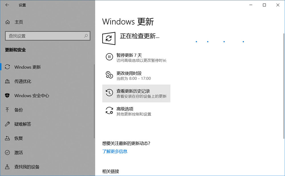 進入 設置 - Windows 設置 - 更新和安全 - Windows 更新,點擊:檢查更新 - 正在檢查更新;