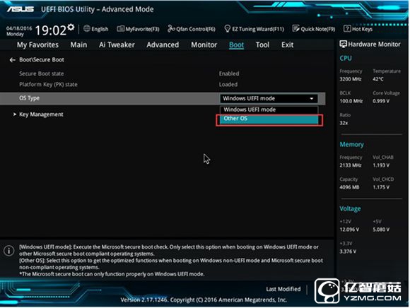 在系統類型(OS Type)里邊將默認的Windows UEFI模式更改為其他系統。