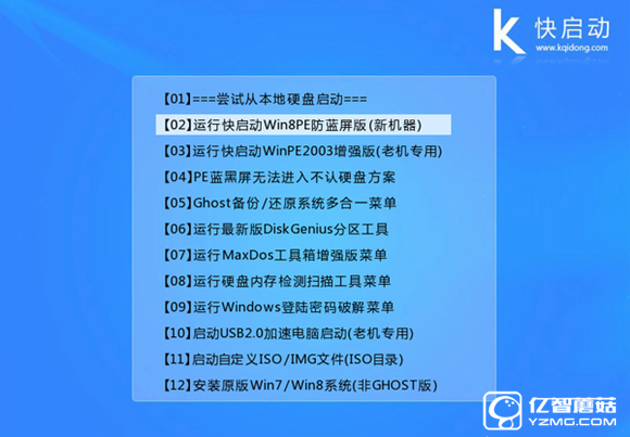 Ⅰ、將快啟動u盤啟動盤連接至電腦,重啟等待出現開機畫面按下啟動快捷鍵進入到啟動項選擇窗口,選取【02】運行快啟動win8PE防藍屏(新機器),按下回車鍵執行操作,如圖所示: