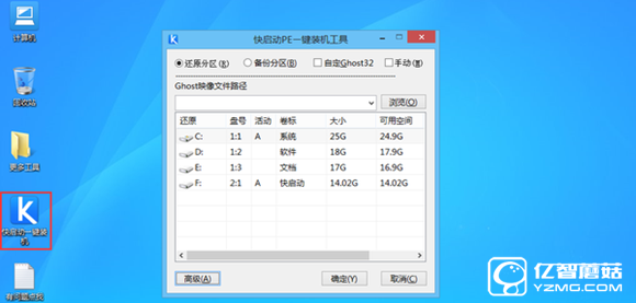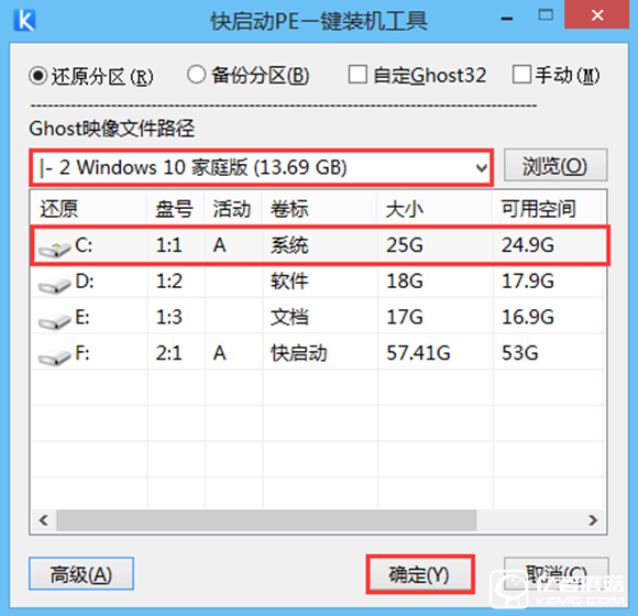 Ⅲ、快啟動裝機工具會自動加載win10系統鏡像包安裝文件,選擇需要安裝磁盤分區(C盤),然后點擊“確定”按鈕,如圖所示: