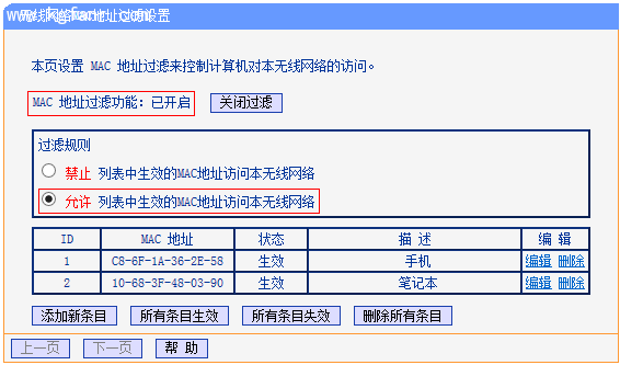 [2] 設(shè)置無線MAC地址過濾。如果使用網(wǎng)絡(luò)的終端基本固定,不會經(jīng)常有其他人接入無線網(wǎng)絡(luò),建議啟用無線MAC地址過濾,只允許所有家庭成員的設(shè)備接入。設(shè)置方法:登錄到路由器的管理界面,點(diǎn)擊 無線設(shè)置 >> 無線MAC地址過濾,把使用環(huán)境中的無線終端MAC地址都添加到允許列表,并啟用規(guī)則: