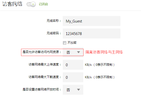 推薦使用訪客網(wǎng)絡(luò)功能,主網(wǎng)絡(luò)只對親友開放,對于一般的來訪者只需告訴他訪客網(wǎng)絡(luò)的無線名稱和密碼。請登錄到路由器的管理界面,點(diǎn)擊 高級設(shè)置 >> 無線設(shè)置 >> 訪客網(wǎng)絡(luò),開啟訪客網(wǎng)絡(luò),設(shè)置無線名稱與無線密碼,點(diǎn)擊保存,如下圖所示。