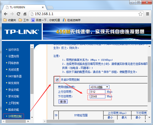 進入無線路由器設置頁面,點擊“IP寬帶控制”,然后勾選啟動寬帶控制,這樣就能夠設置上傳寬帶和下載寬帶的大小了,從而限制流量來避免網速過慢。