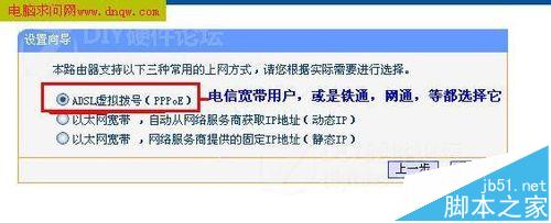 2、在彈出的對話框中勾選下次不提醒 然后點(diǎn)擊下一步 選擇你的上網(wǎng)方式 下一步 輸入寬帶帳號和密碼