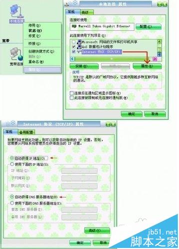 2、設(shè)置計(jì)算機(jī):每臺計(jì)算機(jī)最好都照如下設(shè)置:網(wǎng)絡(luò)鄰居-右鍵-屬性,本地連接-右鍵-屬性,TCP/IP屬性,自動獲取。