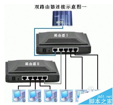 此種方式將路由器Ⅱ當(dāng)作集線器(HUB)使用,在某種意義上來說可以看成是透明的。因此所有的計(jì)算機(jī)的地位是平等的,訪問局網(wǎng)共享也毫無阻力。但此種方法會消耗掉2個LAN口,因此多加一個4口路由器只能最多接6臺電腦。因?yàn)槁酚善鳍驇缀跏峭该鞯模虼私勇酚善鳍虻碾娔X的網(wǎng)關(guān)應(yīng)該和①②③臺電腦一樣是路由器Ⅰ的IP地址,但是由于路由器Ⅱ的DHCP可能造成分配IP地址給④⑤⑥時把網(wǎng)關(guān)設(shè)置成自己,因此在上面需要指定一下。
