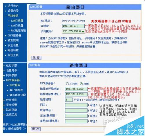要點(diǎn):更改第二個路由器自己的IP地址,關(guān)閉它的DHCP。