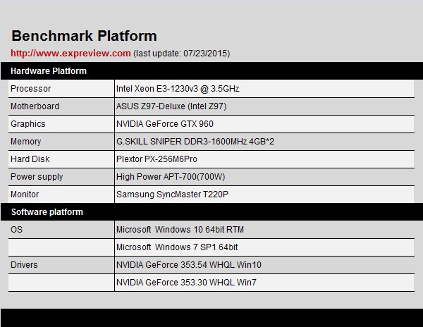 測(cè)試平臺(tái)使用Intel Xeon E3-1230v3處理器,華碩Z97-Deluxe主板,芝奇SNIPER DDR3-16004GB*2內(nèi)存,顯卡是NVIDIA公版GTX 960,系統(tǒng)盤使用浦科特M6Pro 256GB,Windows 10系統(tǒng)使用的是系統(tǒng)更新中心推送下來的353.54WHQL驅(qū)動(dòng),Windows 7系統(tǒng)則使用現(xiàn)在官網(wǎng)上最新的353.30 WHQL驅(qū)動(dòng)。