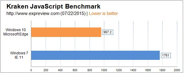 大家可以看到微軟Edge瀏覽器的性能是如此的搶眼,面對(duì)IE11是完勝,在Octane 2.0 JavaScriptBenchmark這個(gè)項(xiàng)目上微軟Edge領(lǐng)先幅度超過了50%!Kraken JavaScriptBenchmark這個(gè)項(xiàng)目的優(yōu)勢(shì)也將近50%,新的瀏覽器表現(xiàn)相當(dāng)值得期待。