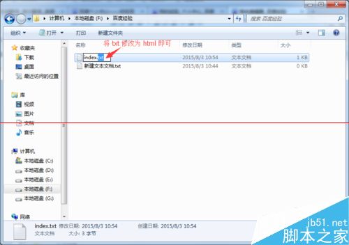 3、重命名剛才創建的命名為index的文本文件,將后綴名txt修改為html,如果系統默認隱藏了顯示后綴名,可以按照步驟4和步驟5執行