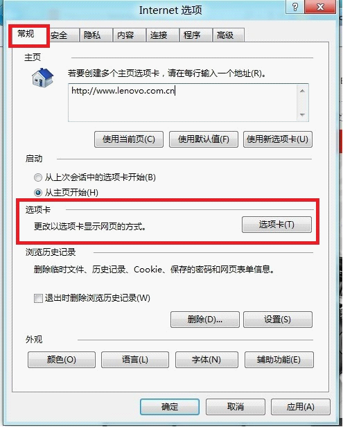 第3步:在打開的IE選項卡中的常規(guī)選項卡中找到并單擊“選項卡”按扭。