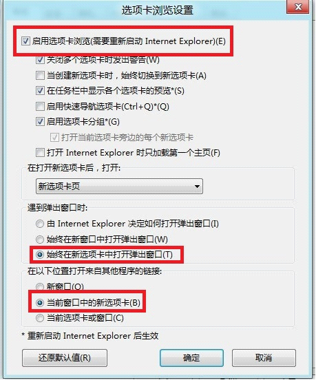 第4步:在打開的選項卡瀏覽設(shè)置界面中,勾選中“啟用選項卡瀏覽”、“始終在新選項卡中打開彈出窗口”、“當前窗口中的新選項卡”這三項,并確定。