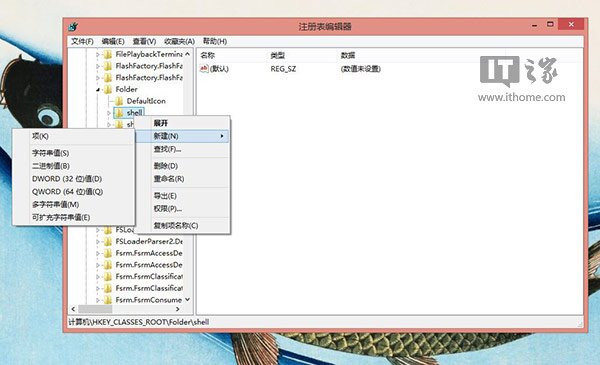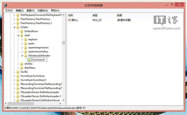 2、打開注冊表編輯器,定位至“HKEY_CLASSES_ROOTFolderShell”路徑,右鍵點擊Shell,選擇“新建-項”,項:“WindowsDefender”。