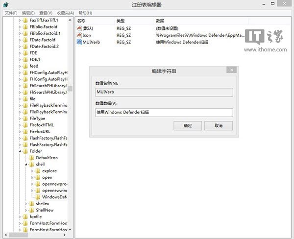 5、依次新建一個名為“MUIVerb”的字符串值,數值為“使用Windows Defender掃描”
