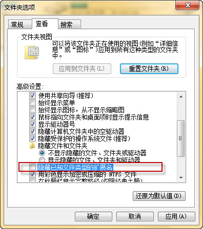 4. 在展開的文件夾選項(xiàng)卡中,瀏覽到查看標(biāo)簽欄,將隱藏已知文件類型的擴(kuò)展名的副選項(xiàng)去掉,如下圖所示:
