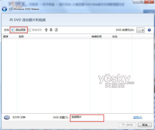 點(diǎn)擊“添加項(xiàng)目”添加需要刻錄到DVD中的照片、視頻等素材。在這里可以自己輸入dvd標(biāo)題文字。