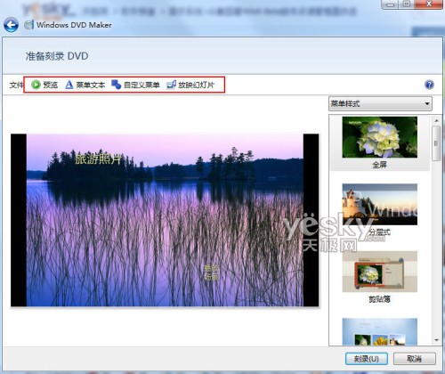 點(diǎn)擊“預(yù)覽”、“菜單文本”、“自定義菜單”、“放映幻燈片”等,可以方便地預(yù)覽視頻效果、設(shè)置菜單文本的字體內(nèi)容、自定義菜單樣式等等。