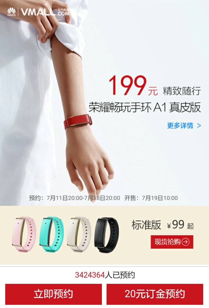 2016年7月11日,榮耀在上海東方體育中心召開榮耀8發布會,同時宣布榮耀暢玩手環 A1 真皮版開啟預售,目前官方商城VMALL和天貓的預約量突破了340萬大關。